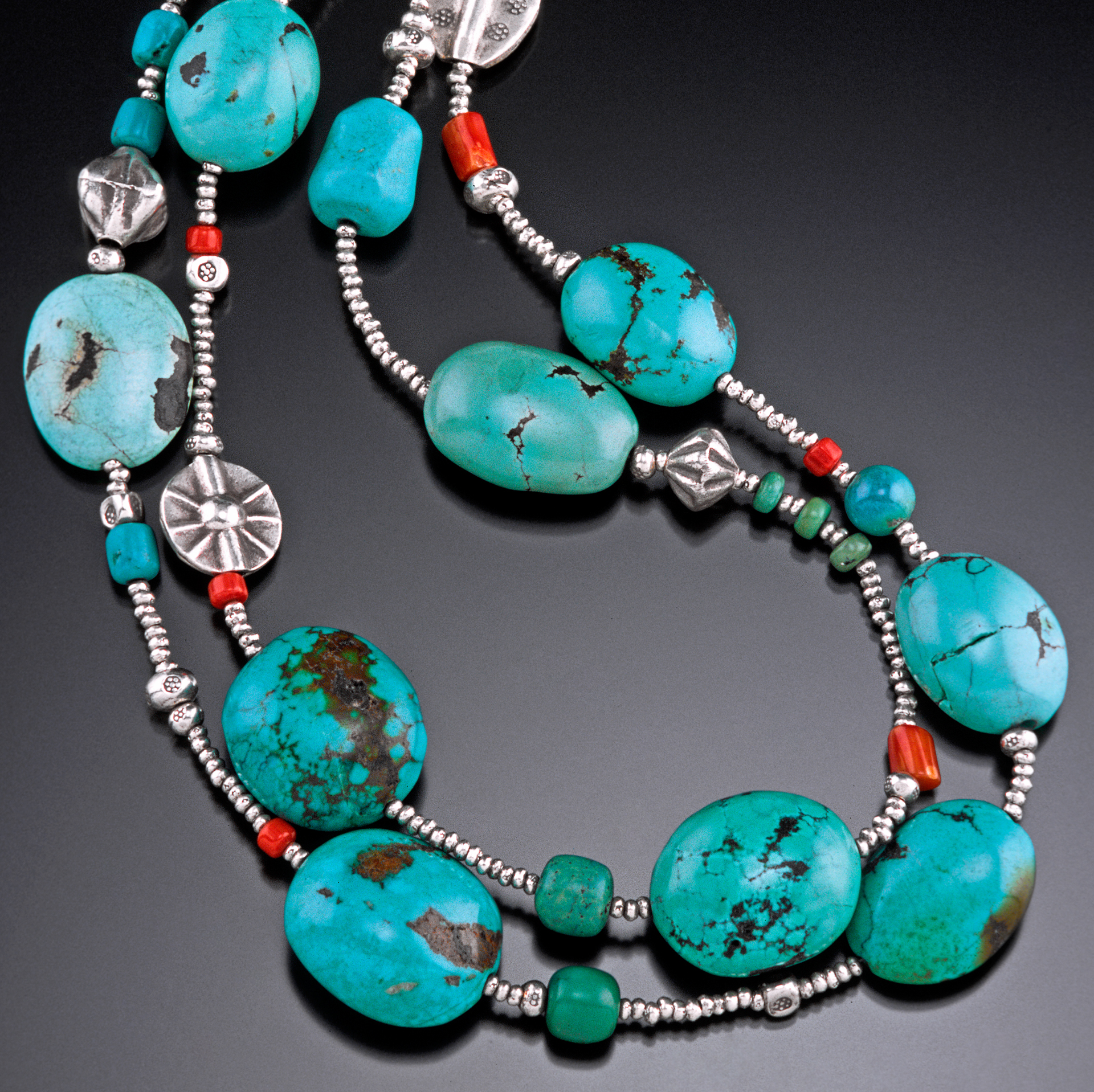 Genuine Turquoise nuggets are interspersed with natural Coral branches and beads offset by micro beads of Hilltribe Silver.